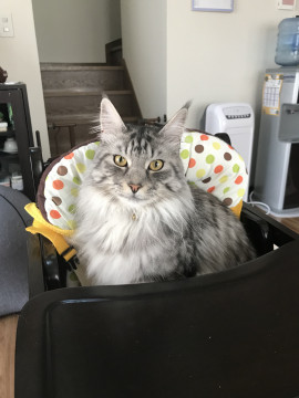 グレーと黒のトラ柄で鼻周りが少し茶色い長毛種です。
