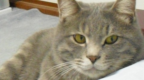 サバトラ(灰色のシマ模様です)5.4キロ去勢済みで胸の二本の横シマがあります。