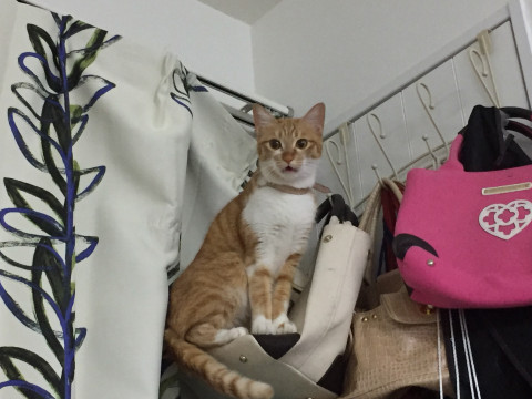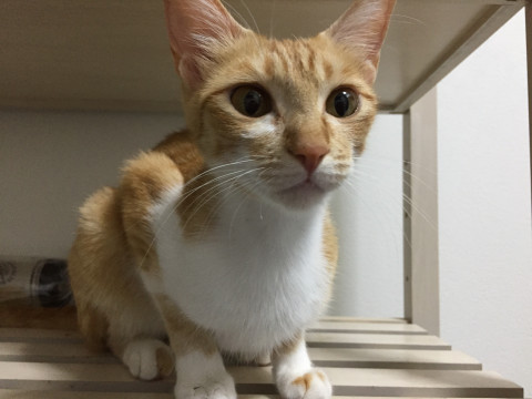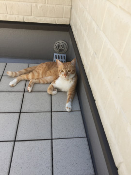 全体的に茶トラですが、顎から胸元は白、足も白です。