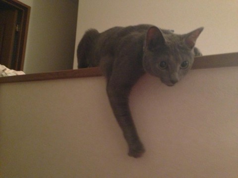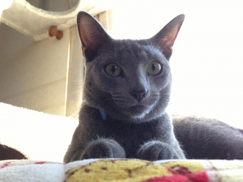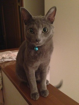 緑の目に綺麗な毛並みのロシアンブルーです。青い鈴の付いた星柄の首輪をしてます。マイクロチップも入ってます。