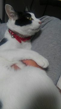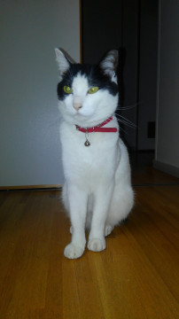 頭以外はほぼ白い、赤いバンダナが首筋にある鈴付きの首輪をつけたハチワレです。