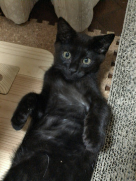 真っ黒の子猫です。生後4ヶ月ほどで体重は約2kgです。