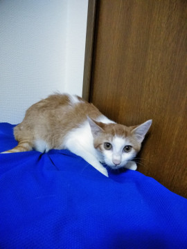 顔が白く頭から背中が茶色、尻尾のあたりが茶色いトラ柄です。