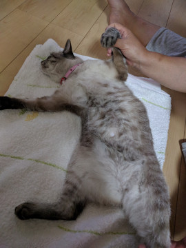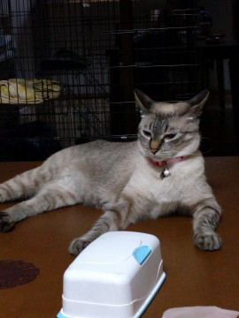 薄っすらとシャム猫のような柄の入った猫ちゃんです。左耳は避妊済みの証で少し切れています。逃げ出した当時、ピンクの首輪をしていました。尻尾が短めです。