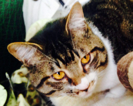 目の色が濃いオレンジです。鼻に特徴的な白い模様があります。慢性鼻炎です。大きさは小柄です。よく鳴きます。