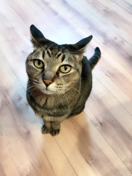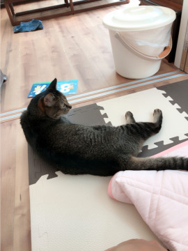 頭頂から背中にかけては黒っぽい。トラ柄は手足と尻尾に主に入っています。
