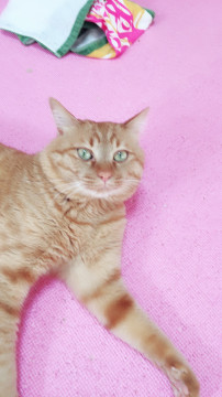 茶トラのグリーンがかった目。オスで去勢済みです。尻尾、体に身体的特徴はありません。首輪もしてません。