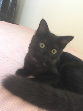 メスの黒猫です。首が少し白い子です。赤い和柄の首輪をしています。嫌がっていたので、外しているかもしれません。子猫のため、体は小さいです。性格は臆病で、知らない人には威嚇します。