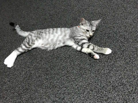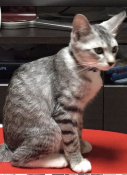 初対面でも喉をゴロゴロ鳴らすくらい人懐っこいサバトラの女の子です。耳が大きめで、靴下を履いた様に4本の足の先が白く、尻尾はまっすぐ、いつもぶんぶん振って、とても元気な子です。