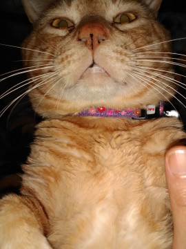 紫色の花柄の鈴つき首輪。外れている場合あり。よく鳴く。
