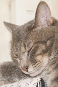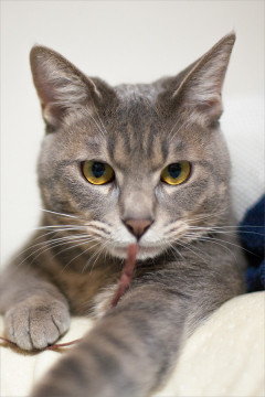 グレイの薄いサバトラで光の加減によってロシアンブルーっぽくも見える雑種です