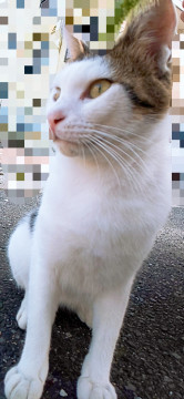 白地に頭、背中の2箇所、尻尾が茶色混じりの黒色。