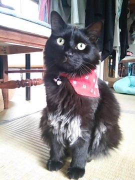 青地にピンクの水玉模様のバンダナ風の首輪を付けてました。