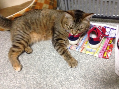 黒っぽいトラ柄小柄で細いです。黒地にピンクのドット柄の首輪をしてます。