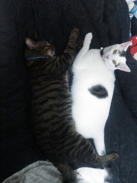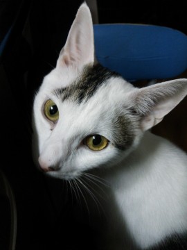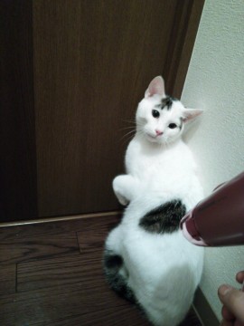 白メインの頭、お腹辺り、尻尾に茶色模様有り。