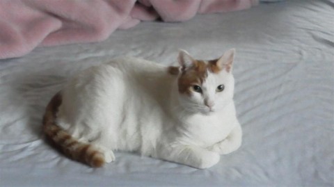 ○白地に、背中と顔に茶トラのブチ。尻尾も茶トラ。鼻と肉球はピンク。