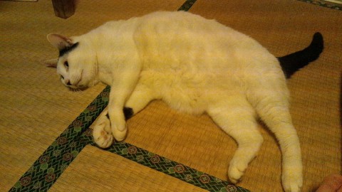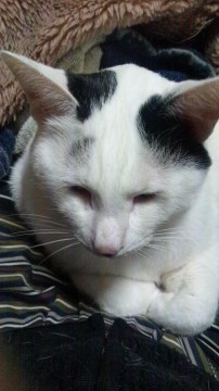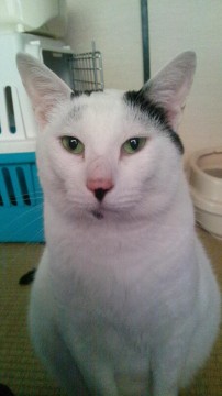 大き目の雄ネコです。尻尾が真っ黒、耳は白く、耳の付近が黒い模様です。背中は真っ白です。