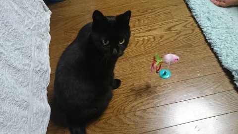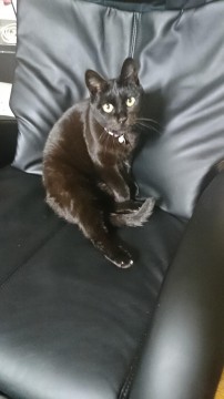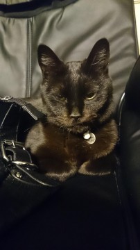小柄でとても人懐こい真っ黒な子です。紫色の首輪を着けていて、札には名前と家の電話番号を記入しています。念のため、首輪の裏にも書いてあります。