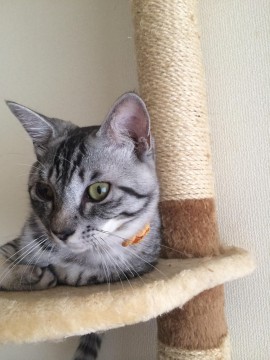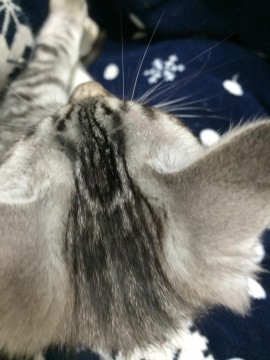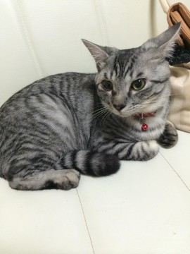 赤い鈴がついた赤い首輪をしているグレーのトラ柄です。尻尾は太めでシマシマ、体重4キロほど。右目の瞬膜が目に癒着しており右目は濁っています。
