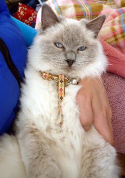 写真の通り、ハーネス型首輪に銀色の鈴を身につけています。