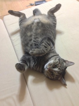 グレーと黒のしま模様のぽっちゃりした猫です。