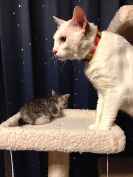 白猫で、尻尾が短いです。 去勢済みです。 オレンジのストライプの首輪をしています。