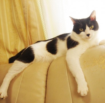 (2)毛色:白黒。背中は黒で右側の肩からお尻にかけて黒の斑点が3つあります。左側は真っ白です。