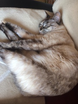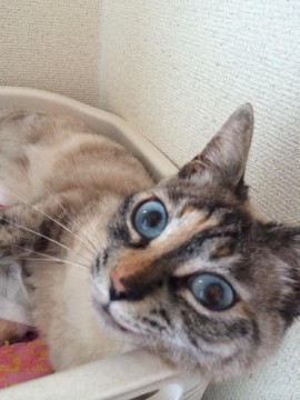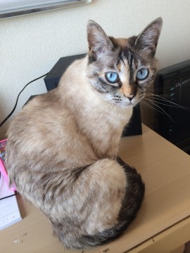 青色の目、かすれた小さい声、尻尾が細長い、シャム系、避妊済み