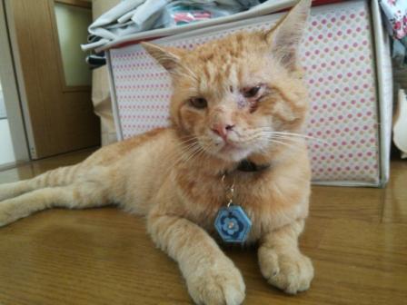 画像の通り左目を怪我をしており治療中、首輪をしているはずですが、外れた可能性あり、尻尾は短い雑種のトラです。
