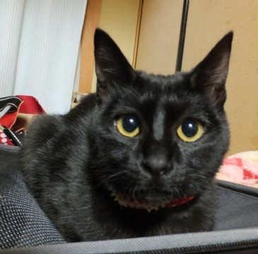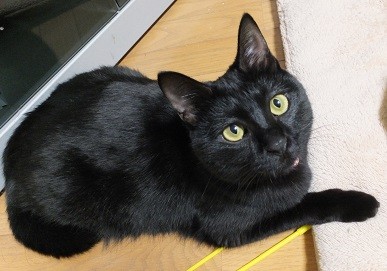 全身真っ黒ですが、お腹に三日月のような白い毛があります。