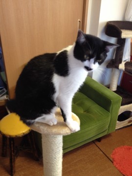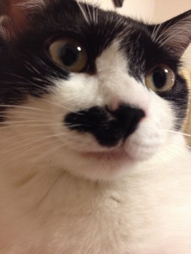 白と黒、ハチワレがきれいじゃない。鼻のあたりに三逆角形のチョビヒゲ模様、尻尾はまっすぐで長いです。