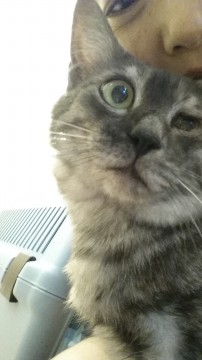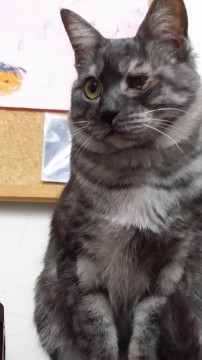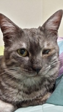 ・全体的にグレー 虎柄が顔と手足しっぽにあり、身体部分は柄が薄め。左まぶたが半分位しか開きません。