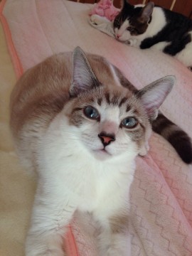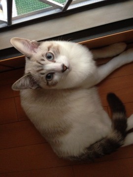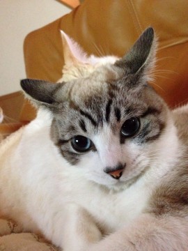 目がブルー。しっぽ・背中・頭から両目にかけて焦げ茶。しっぽは縞模様。鼻は周りが黒で真ん中がピンク。声が高い。