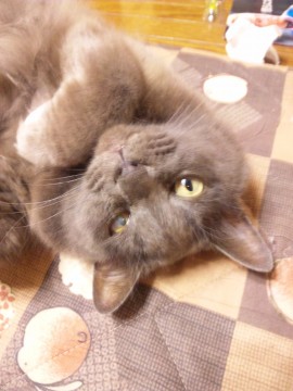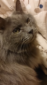 グレーで少し毛が長めです。くしゃみをすることが多く、目やにもでやすいコです。大きい音が苦手で優しく声をかけてくれる人が好きです。首輪はしていません。