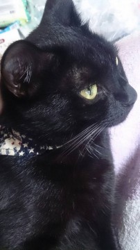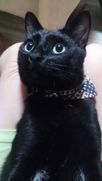 写真と同じバンダナ風の鈴付き首輪を付けています。
