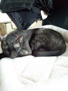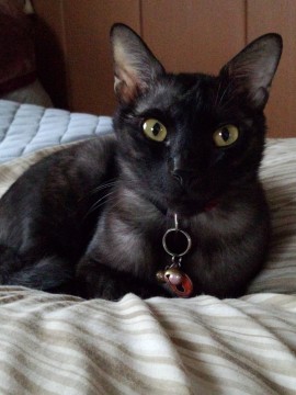 黒猫(全体的に薄い黒色)、目は黄色、尾はかぎしっぽです。去勢済み。
