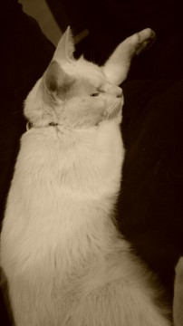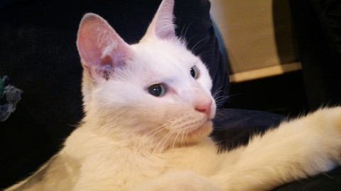 雄ネコで、全身が白く、尻尾が短いです。ダミ声です。