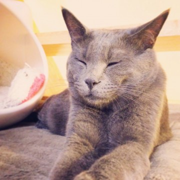ロシアンブルー風のグレーの猫。