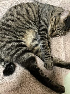 小形〜中型のキジトラです。尻尾の長さは短め30センチくらいで曲がってます。