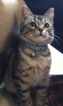 水色の首輪を付けています。(鈴・ネームプレート・ハートの模様入り)