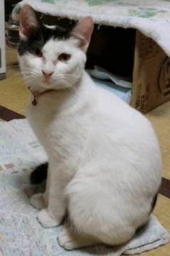 毛色:白地に尻尾と頭の右側から後頭部にかけて黒です。