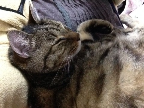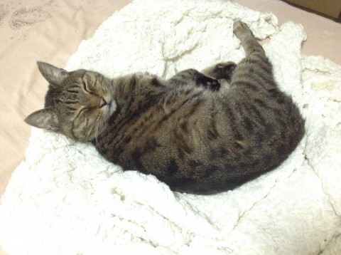 飼い猫の餌を食べ、飼い猫のベットで寝ていたのを発見。