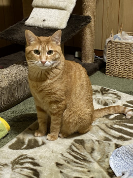 全身茶トラの優しいお顔で、鼻から下はやや白く、瞳の色はグリーン。尻尾は長め、手足は短めです。里親さん探しをする方向だった為、耳カットはしていませんが避妊手術済み。首輪はしていません。