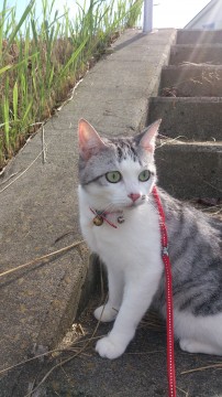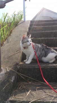 赤い首輪 お中と足が白く背中側はグレーの縞