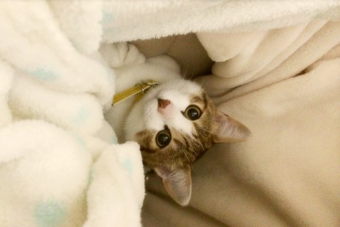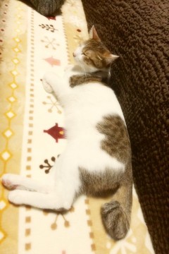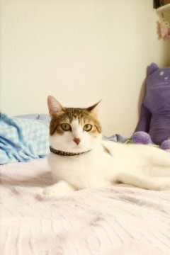 キジトラ白。尻尾が曲がっている(カギ尻尾)。お腹は真っ白。3〜5㎏。去勢手術済み。人懐こい性格。二階建てのいで室内飼い。外に出したことはない。毛並み綺麗。