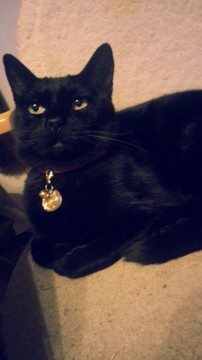 お花の首輪をしており、電話番号が書いてあるタグをつけてます。