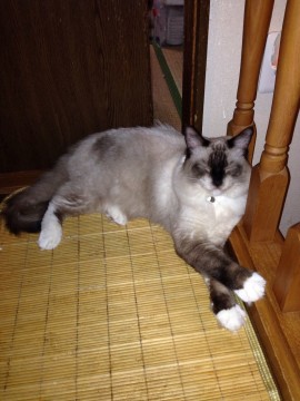 ベージュに近い白地に、顔、耳、尻尾、手足はこげ茶色。