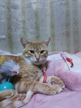 トラ猫、首輪2つけたまま、赤リード付、去勢手術抜糸まだの状態