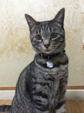 鈴の付いたピンクの首輪をしていて、動くと、鈴が鳴ります。