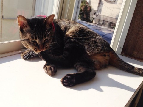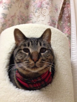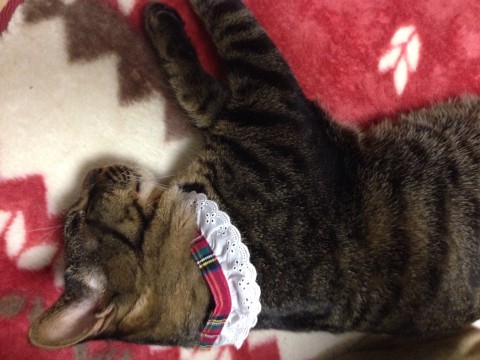キジトラで取れてなければ赤いチェックとフリルの首輪をしています。